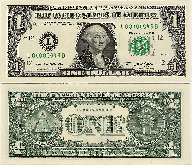 2013 FRN-L One Dollar, Low serial number L00000049D.