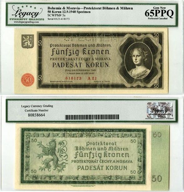 Bohemia & Moravia 1940 50 Korun, SPECIMEN Note, Pick 5s, B105as. Gem New (Legacy65ppq)