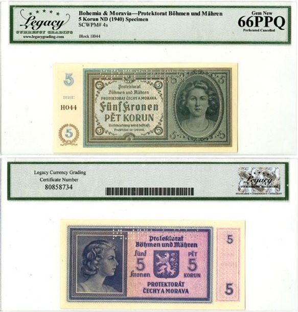 Bohemia & Moravia ND (1940) 5 Korun, SPECIMEN Note, Pick 4s, B104cs. Gem New (Legacy66ppq). **SOLD OUT**