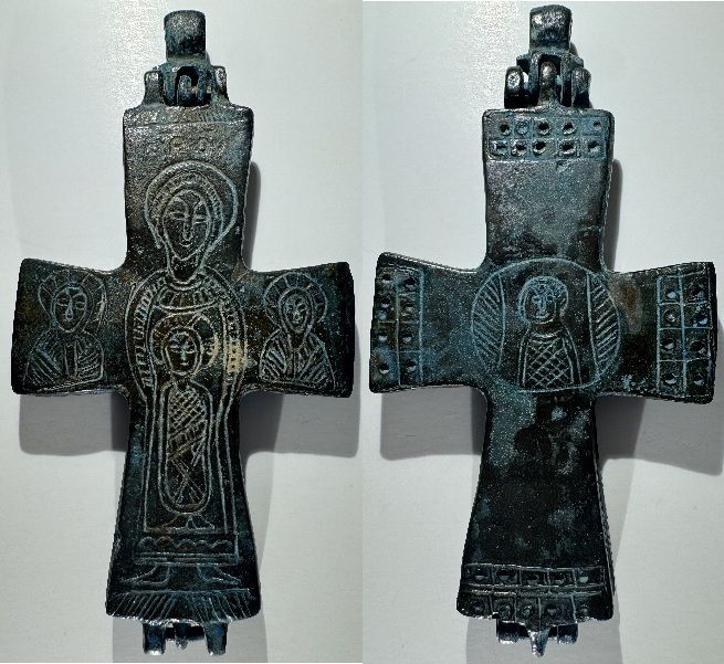 BYZANTINE EMPIRE: Bronze Reliquary Cross of Panagia (Turkey/Bulgaria area, 9th-11th Century), 106mm.