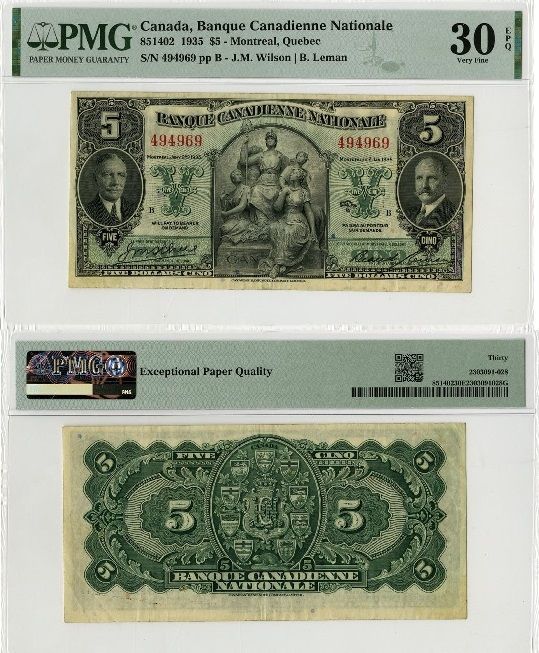 Canada: Banque Canadienne Nationale 1935 5 Dollars, Pick S706a. Very Fine (PMG-30epq)