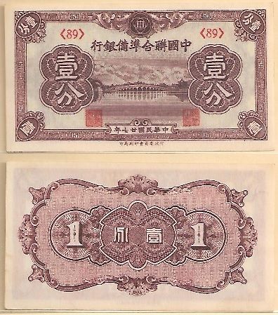 > China: Federal Reserve Bank of China 1938 1 Fen, Pick J46a, B5414a