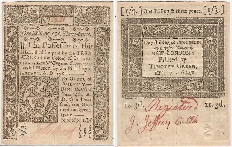 > CONNECTICUT June 19, 1776 1 Shilling 3 Pence; CT-208.