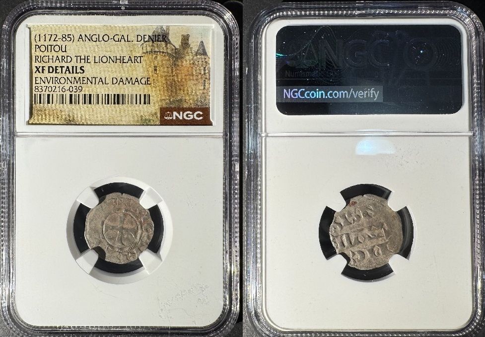 CRUSADORS: Poitou: Richard the Lionheart Ar Anglo-Gallic Denier of 1172-85. NGC XF details, Environmental damage. *pending*
