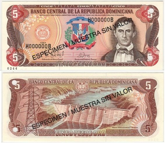 Dominican Republic 1997 5 Pesos Oro, SPECIMEN Note, Pick 152s2, B652cs. **SOLD OUT**