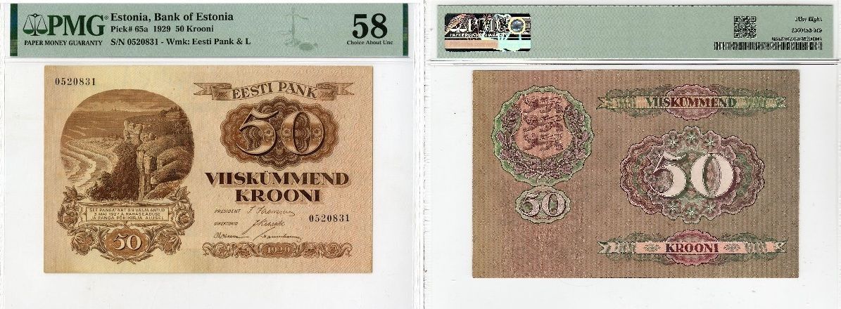 Estonia 1929 50 Krooni, Pick 65a, B210a. PMG58 (Choice About Uncirculated). **SOLD OUT**