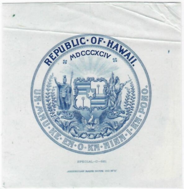 Hawaii, 1896. Intaglio Proof of Hawaiian Arms in blue, Printed on india paper, 7.5 x 8 cms. Hawaiian arms at center, Republic of Hawaii on top and Hawaiian language on bottom, "Special C-621" imprint at bottom center. Used on the back of the 1895 (1897) Silver Certificate of Deposit Issue - Series C, P-11 to P-15. Crisp VF condition due to folds from archival storage. Rare. **SOLD OUT**
