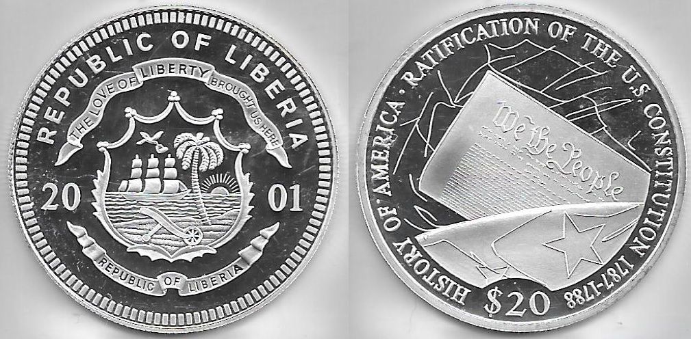 > LIBERIA 2001 20 Dollars, Ratification of U.S. Constitution, KM-716