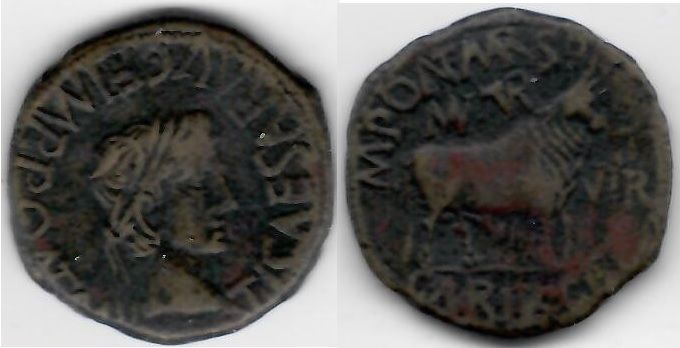 MUNICIPIUM TURIASO Ae As (13.43g) of Tiberius (14-37 CE); M. Pontius Marsus and C. Marius Vegetus. **SOLD OUT**