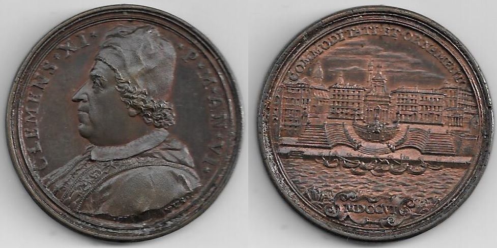 PAPAL STATES: Clement XI, Giovanni Francesco Albani di Urbino (1700-21) 1706 Ae Annual Medaille; Construction of the Ripetta harbor port in Rome. **SOLD OUT**