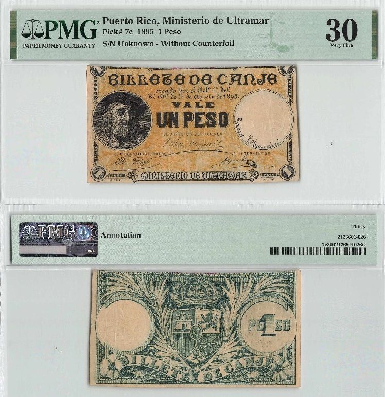 PUERTO RICO: 17 Aug 1895 1 Peso, variety without counterfoil, Pick 7c. PCGS VF30 annotation.