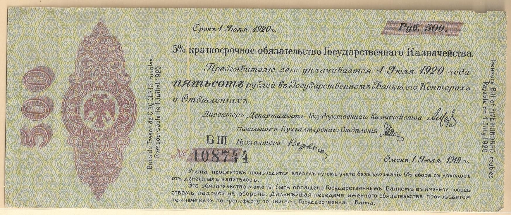 Russia: Provisional Siberian Administration 1919 500 Rubles, Pick S867. **SOLD OUT**