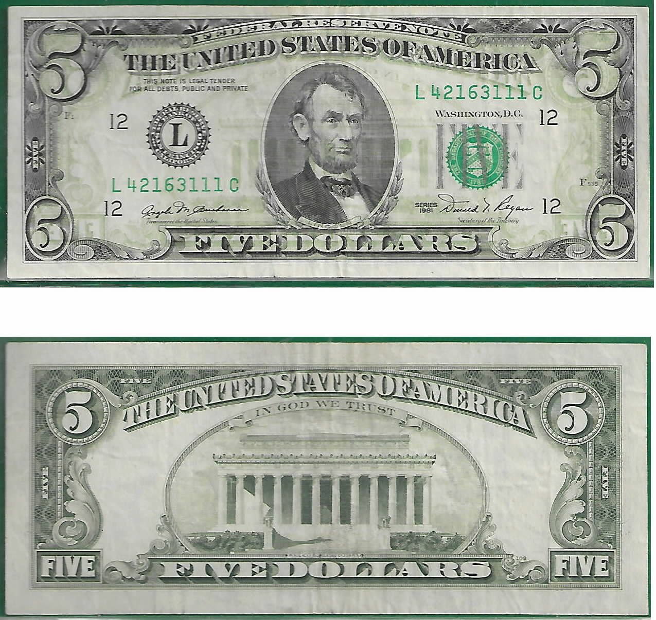 1981 FRN-L $5 complete offset transfer. Very Fine. **SOLD OUT**