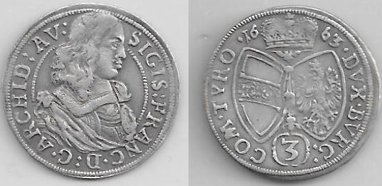 > AUSTRIA: Tirol: Sigismund Franz (1662-65) 1663 3 Kreuzer; Enz 11. **SOLD OUT**
