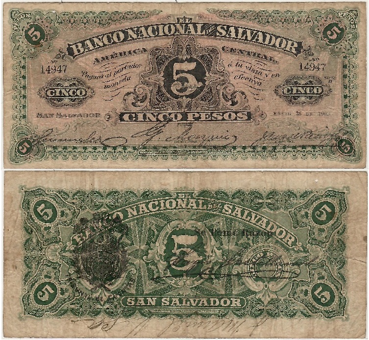 BANCO NACIONAL Del SALVADOR 26 January 1909 5 Pesos, Pick S162c