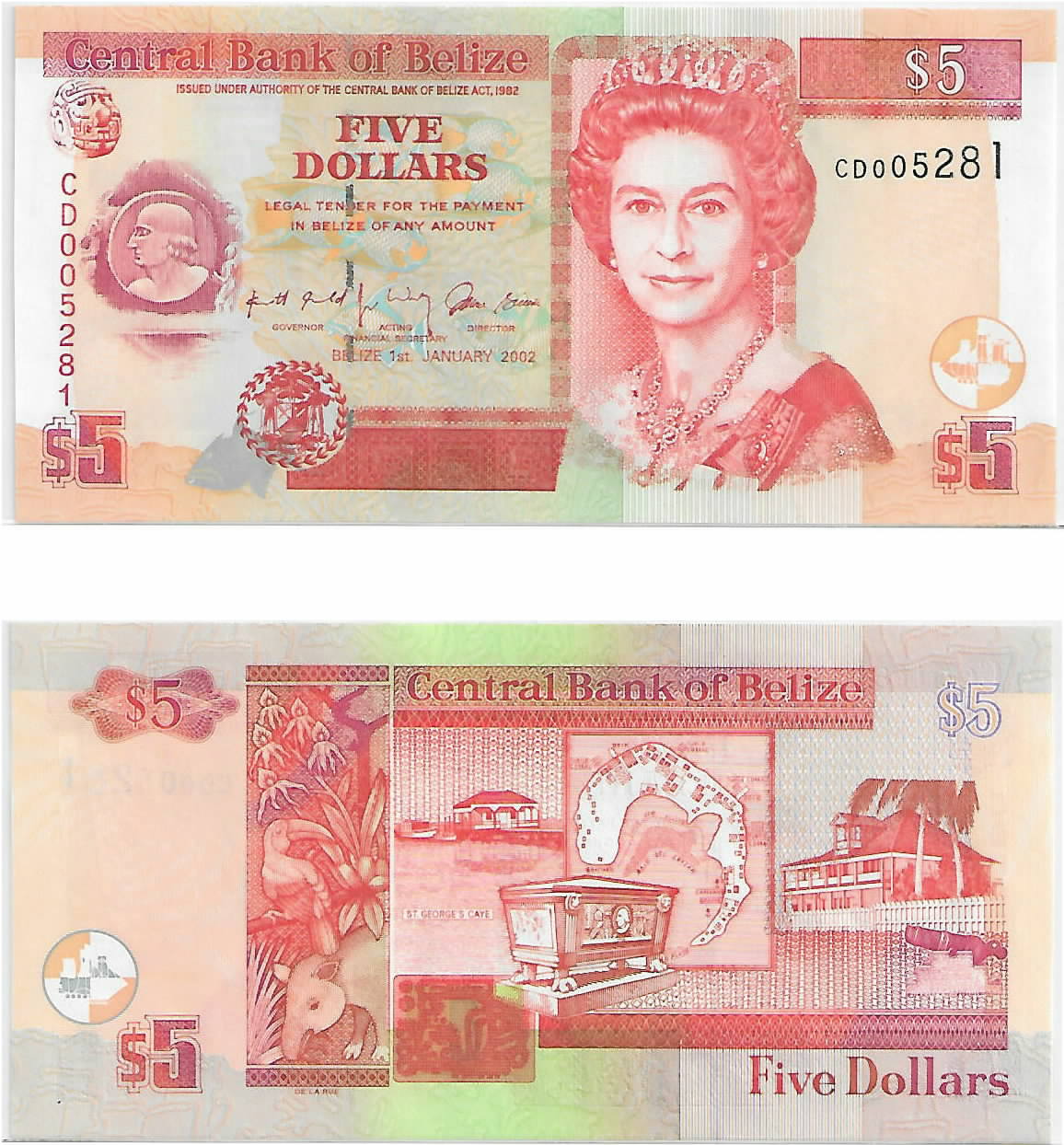 > Belize 2002 5 Dollars, Pick 61b, B319b
