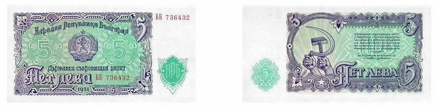 Bulgaria 1951 5 Leva, Pick 82a, B189a.