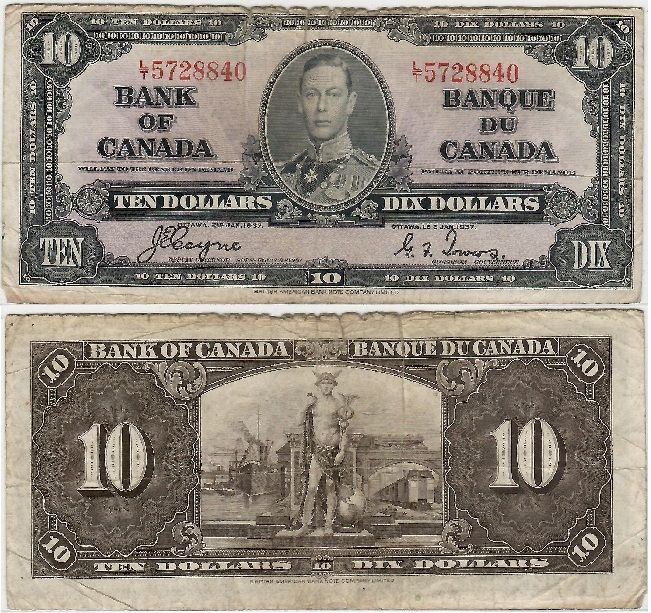 Canada 1937 10 Dollars, Pick 61c, B324c. Very Fine, but with ragged top edge.