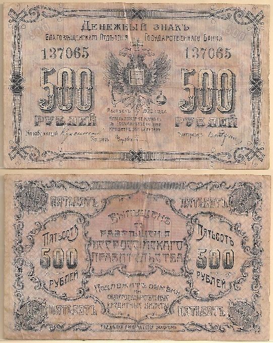East Siberia: Blagoveshchensk 1920 500 Rubles, P-S1259B. Fine. **SOLD OUT**
