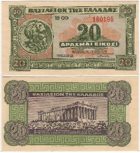 > Greece 1940 20 Drachmai, Pick 315