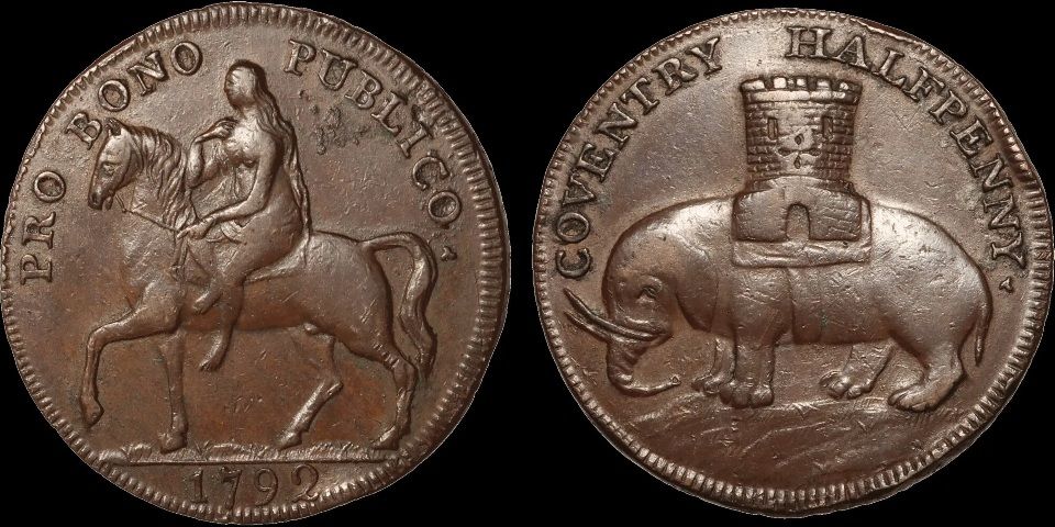 GREAT BRITAIN 1792 Coventry Halfpenny (31mm, 12.84g); D&H Warwickshire 231. Obv: Lady Godiva on horseback; Rev: Elephant and Castle. Large flan; small area of roughness in obverse field. About Extremely Fine.