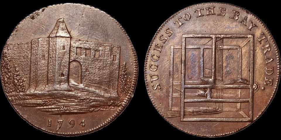 GREAT BRITAIN 1794 Colchester Halfpenny (29mm, 8.68g); D&H Essex 10. Obv: Colchester Castle; Rev: loom. Die rust. Uncirculated.