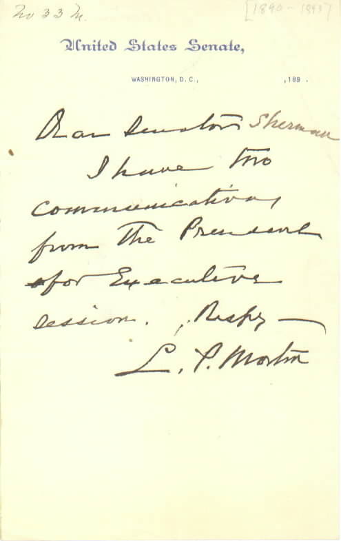 Levi P. Morton (1824-1920, Harrison's Vice President, Minister to France, Governor of N.Y.) undated autographed letter to Sen. John Sherman on 4-7/8" x 7-7/8" Senate stationary. **SOLD OUT**