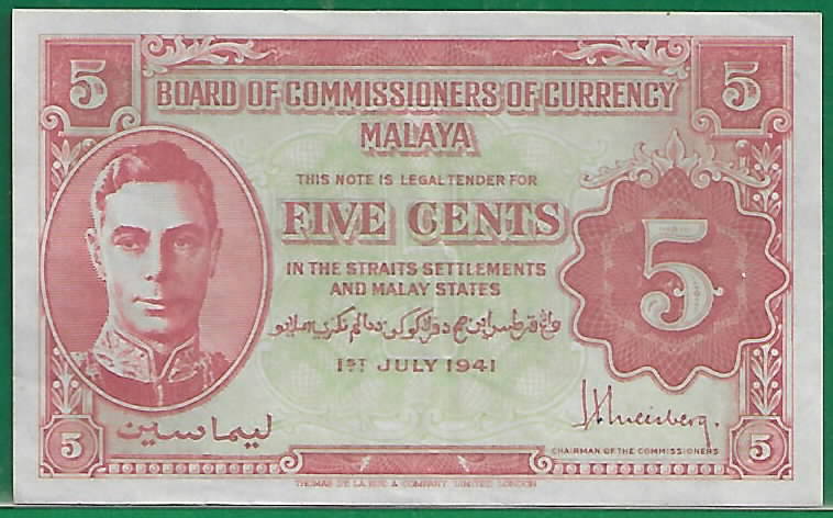 > Malaya 1941 (1945) 5 Cents, Pick 7b, B108b. **SOLD OUT**