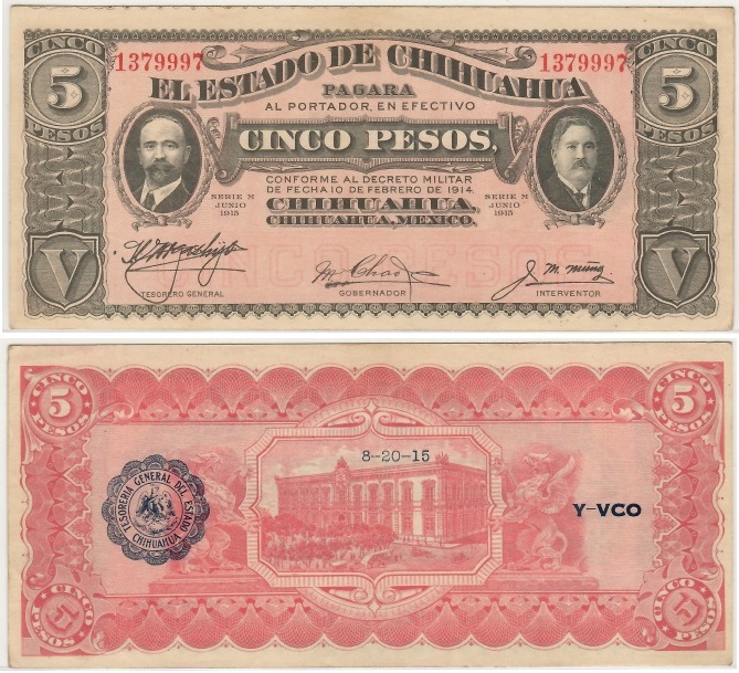 > Mexico: El Estado de Chihuahua June 1915 5 Pesos, Pick S532A