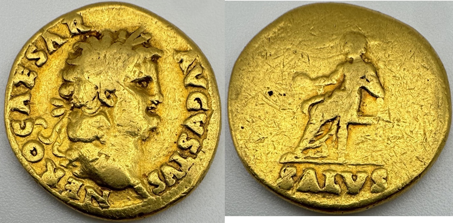 NERO (54-68) Av Aureus of 65-66 (6.3g); SR-1932, RIC-59. Obv: Laureate head right; Rev: Salus enthroned left holding patera. *pending*