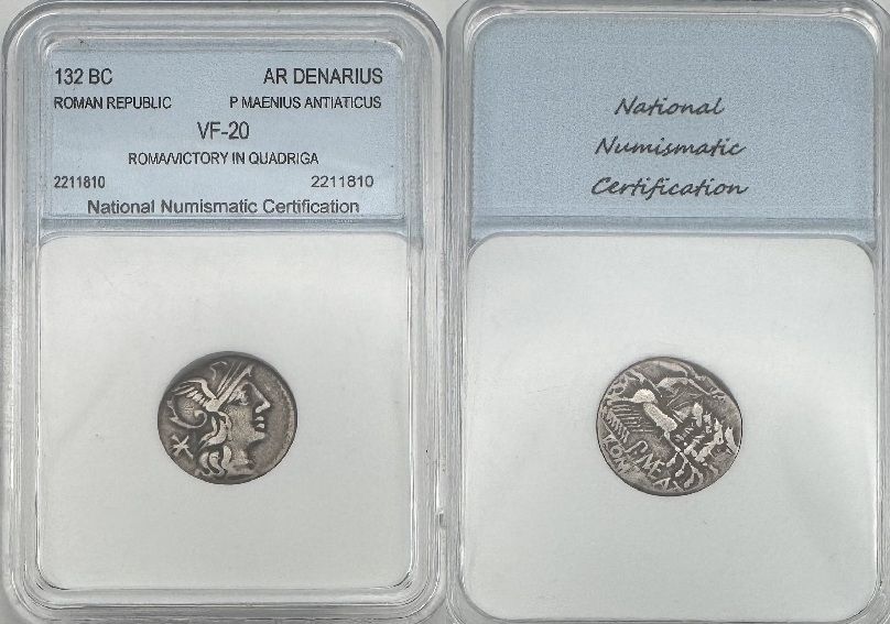 > ROMAN REPUBLIC: P. MAENIUS ANTIATICUS Ar Denarius (c.132 BCE); RSC Maenia 7