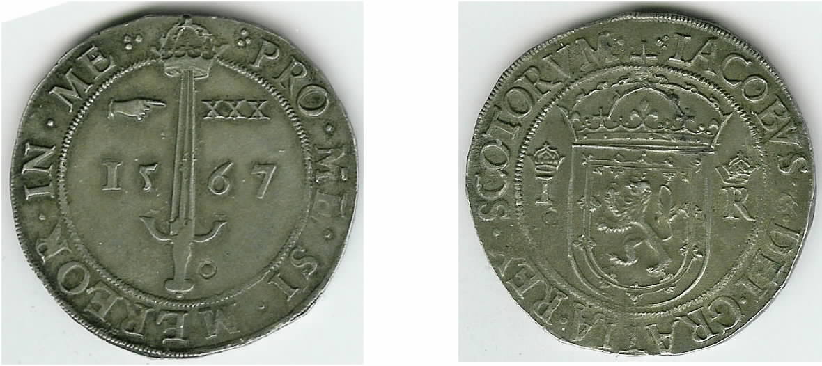 SCOTLAND: James VI, House of Stuart (1567-1625); 1567 Ar "Sword Ryal"; Davenport 8463. **SOLD OUT**