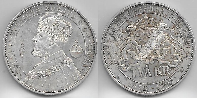 > SWEDEN 1897 2 Kronor, Silver Jubilee, KM-762