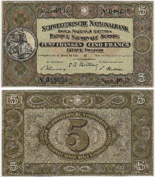 Switzerland 1949 5 Franken, Pick 11n, B305n. Very Fine to Extremely Fine.
